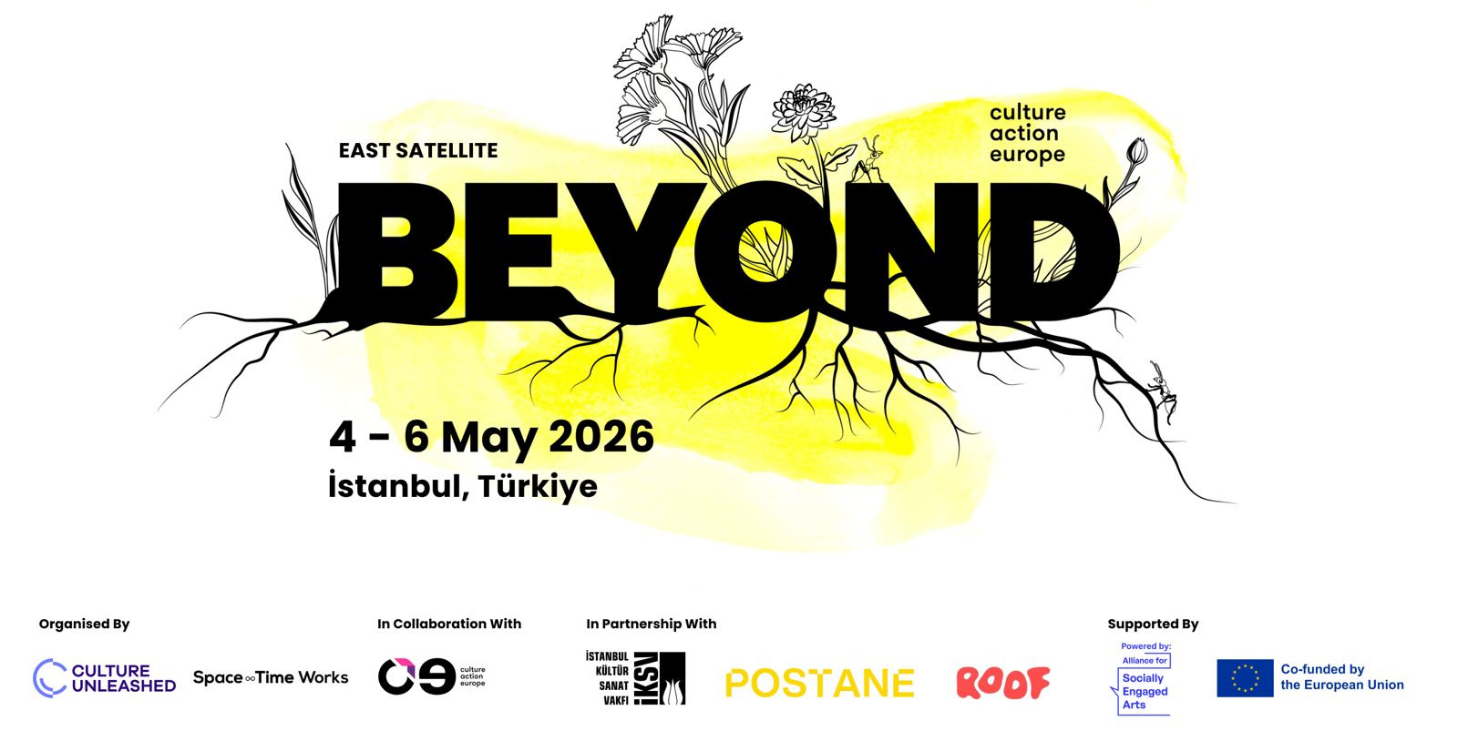 The East Satellite BEYOND event titled ‘Between Neighbors: Crossing Voices, Crossing Borders’ will be organised by Culture Unleashed and Space-Time Works AB in partnership with İKSV, Postane, and Roof, in collaboration with Culture Action Europe, powered by Alliance for Socially Engaged Arts, and co-funded by the European Union. East Satellite BEYOND will take place in Istanbul between 4-6 May 2026. The event will be in English.