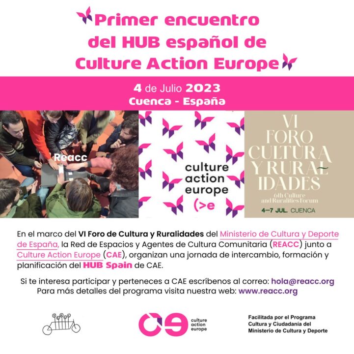 On Tuesday, 4 July 2023 the members of Culture Action Europe in Spain will meet in Cuenca. The first meeting of a kind in Spain, organised by Red de Espacios y Agentes de Cultura Comunitaria, REACC, will be held within the VI Forum ‘Culture and Ruralities’ of the Culture and Citizenship program of the Ministry of Culture and Sports of Spain.