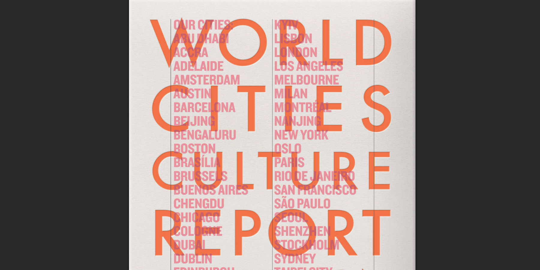 The World Cities Culture Forum released the 5th edition of their World Cities Culture Report in October 2025, which showcases key findings, policy insights, and regional insights into how cultural policy is contributing to urban development across the world, with more than 125 examples of city projects provided. The last report was published in 2022 in the wake of the COVID-19 pandemic, with a particular focus on how cities had responded to its challenges.